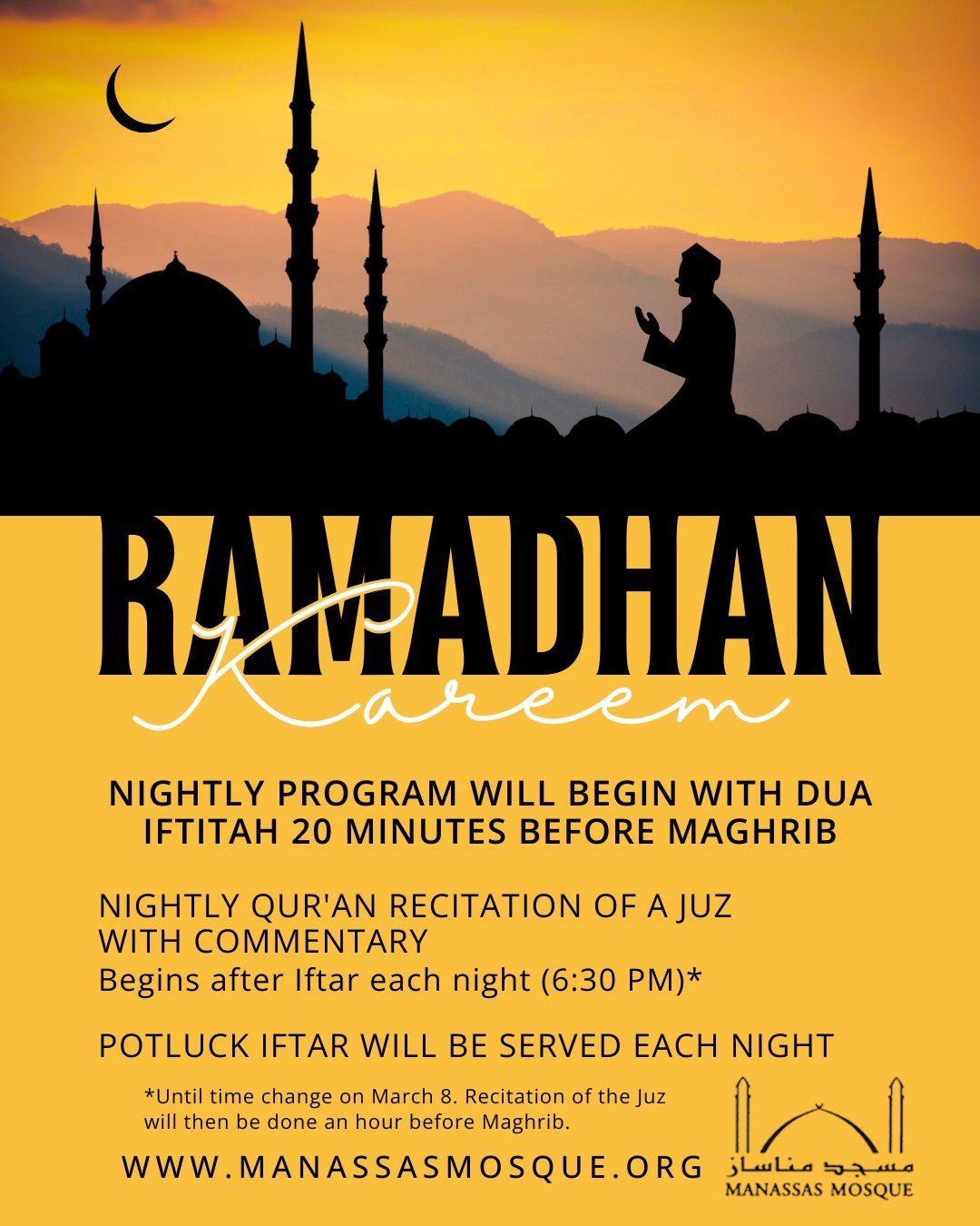Begins 20 minutes before Maghrib. Potluck Iftar served each night.